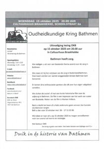 De Oudheidkundige Kring Bathmen (OKB) is een vereniging met meer dan 900 leden. Doel is het vergaren en verspreiden van kennis over Bathmen en de bijbehorende buurschappen.We organiseren lezingen, winterwandelingen, en af en toe een zomerexcursie.Daarnaast verschijnt ons kwartaaltijdschrift “Oud Bathmen”. Hierin wordt de historie van Bathmen van vele kanten belicht en geïllustreerd met mooi en uniek fotomateriaal.